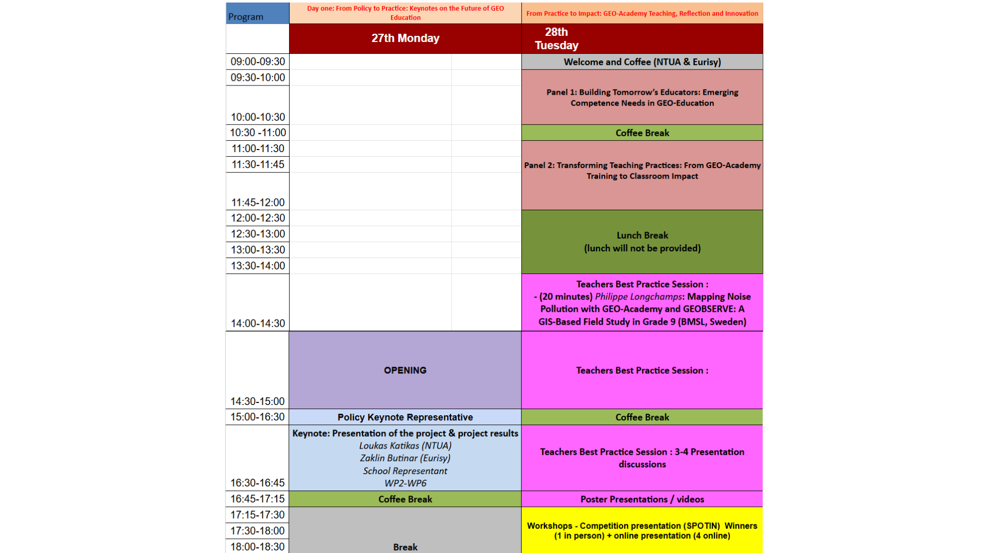 The conference opens on Monday, 27 April 2026 with a series of keynote talks and project results and presentation that set the scene for GEO‑Academy’s mission and impact. Keynotes include the project presentation, its importance, and policy insights on future educational competencies.